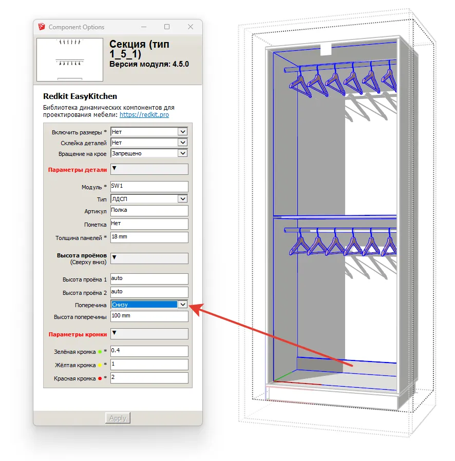 По просьбе пользователей, в секции были добавлены поперечины, которые довольно часто используются в шкафах. Включить их можно в параметрах секции. Есть 4 базовых позиции поперечины: