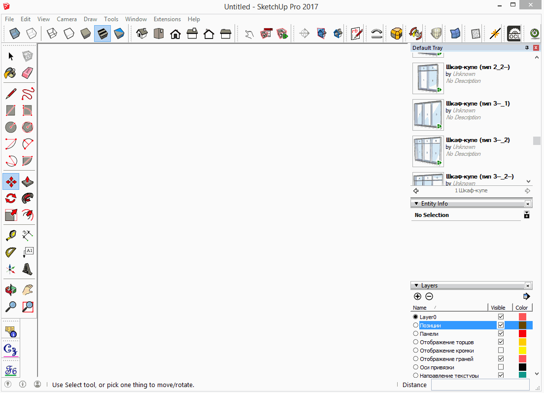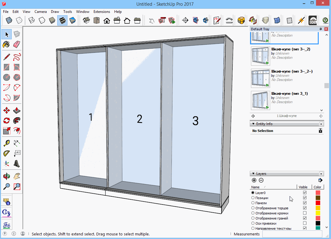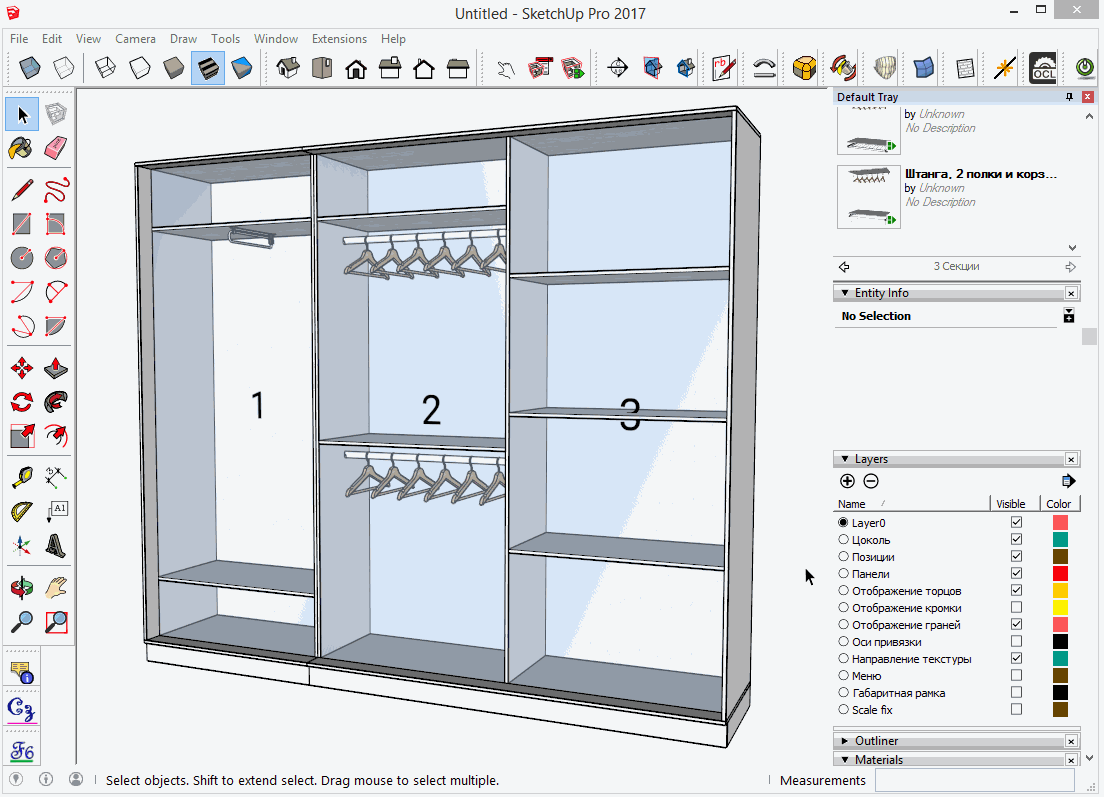 Итак, основа EasyCabinets - это шаблоны. На текущий момент есть шаблоны шкафов-купе и распашных шкафов. В планах есть расширение этого дополнения на другие типы корпусной мебели. Когда вы достаёте шкаф из библиотеки, отсеки в нём подсвеченны голубым цветом и пронумерованы. Нумерация нужна, чтобы вы понимали где и какой отсек находится. Это называется "Позиции". Их можно скрыть через слои.
