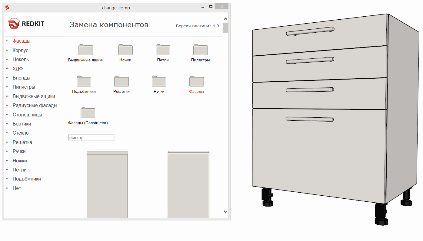 Кстати, эти "кусочки фасадов" сохранили полный функционал полноценных фасадов. Можно поменять ширину рамки и фрезы или включить стекло. Даже решётку можно добавить, если фантазию не остановить вовремя :)