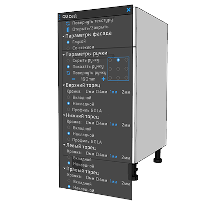 Особо стоит отметить возможность расстановки кромки на панелях через динамическое меню - то о чём многие просили. Теперь это очень удобный и наглядный функционал. Меню с кромкой выскакивает отдельно после клика по пункту "Параметры кромки" и располагается в одной плоскости с деталью, на которой Вы хотите расставить кромку. Кроме этого, меню считывает текущие параметры панели. Так что сразу становится видно - с какой стороны деталь уже закатана, а с какой нет: