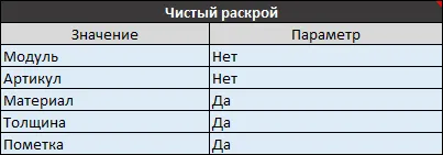 Для некоторых производств такая дополнительная информация в раскрое будет весьма полезна. Но помните о том, что при конкатенации все параметры со значением "Да" будут учтены и детали различающиеся хотя бы одним из параметров будут разделены в чистом раскрое. Таким образом могут появится не объединённые, но одинаковые по размерам детали, отличающиеся лишь данными из других столцов, таких как "Модуль", "Артикул" и т.д.