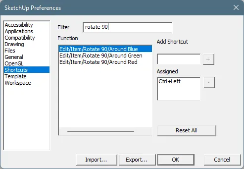 Каждой из этих функций можно назначить своё сочетание клавиш. Для себя, например, вращение вокруг синей оси я сделал сочетание Ctrl + стрелка влево. Не забудьте нажать на плюсик, чтобы добавить сочетание клавиш к функции. Смотрите картинку: