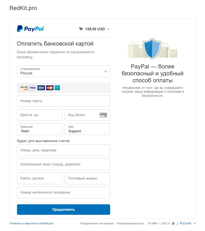 3. Осталось только заполнить форму. Выберите вашу страну, введите данные карты, свой адрес и номер телефона. После этого нажмите "Продолжить" и совершите платёж: